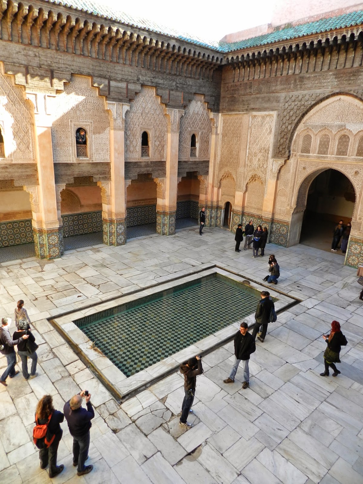 A Marrakech si trova anche la scuola coranica più grande del Marocco: è la Medersa Ben Youssef, la più antica della città, edificata nel XII secolo. All’interno si accede ad un cortile centrale, nel mezzo del quale si trova una vasca di marmo bianco per le abluzioni, circondato da gallerie decorate da bellissimi stucchi in gesso.