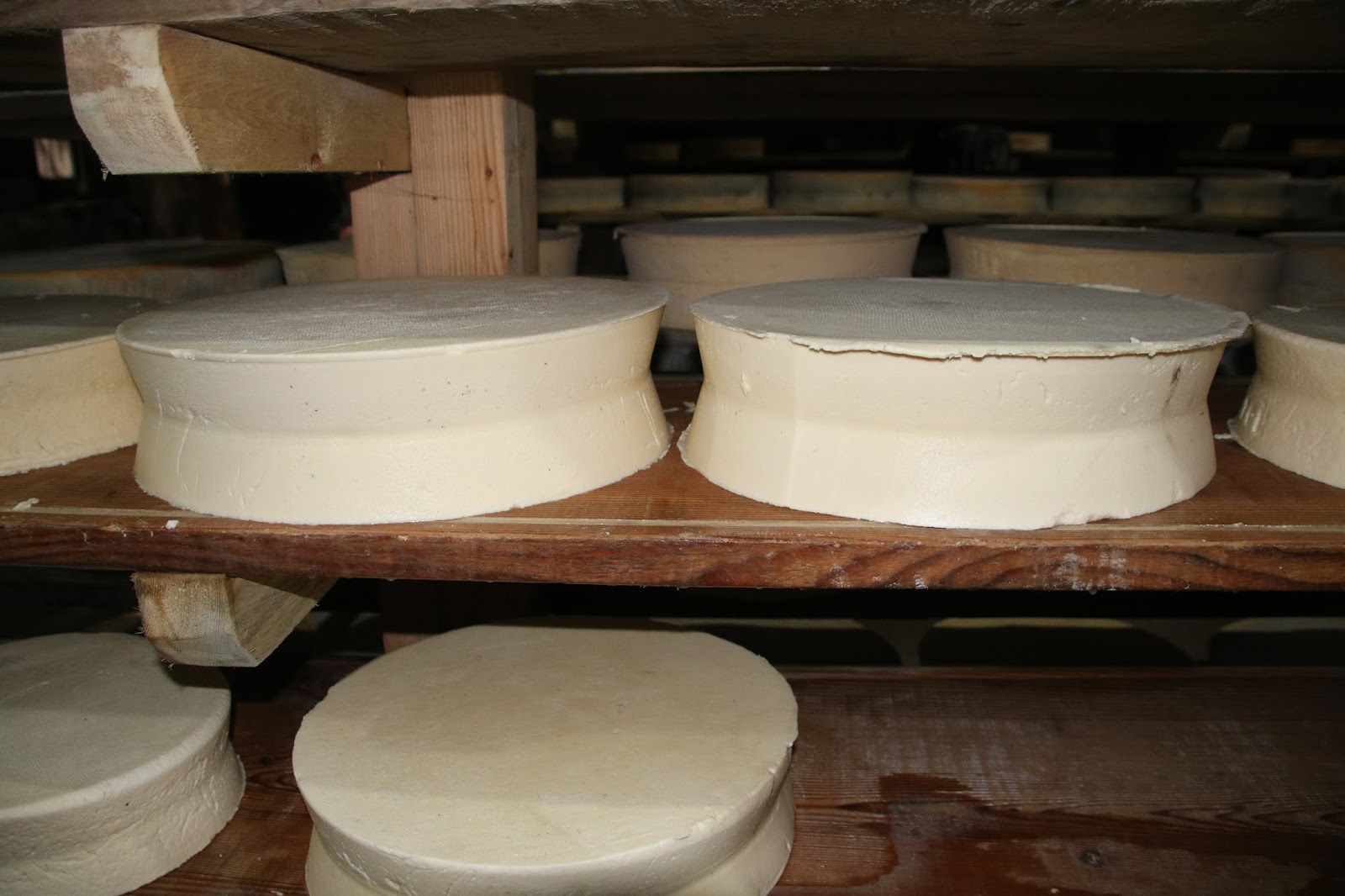 | Forme di Bitto DOP in stagionatura nella Casera del Rifugio Alpe Piazza |