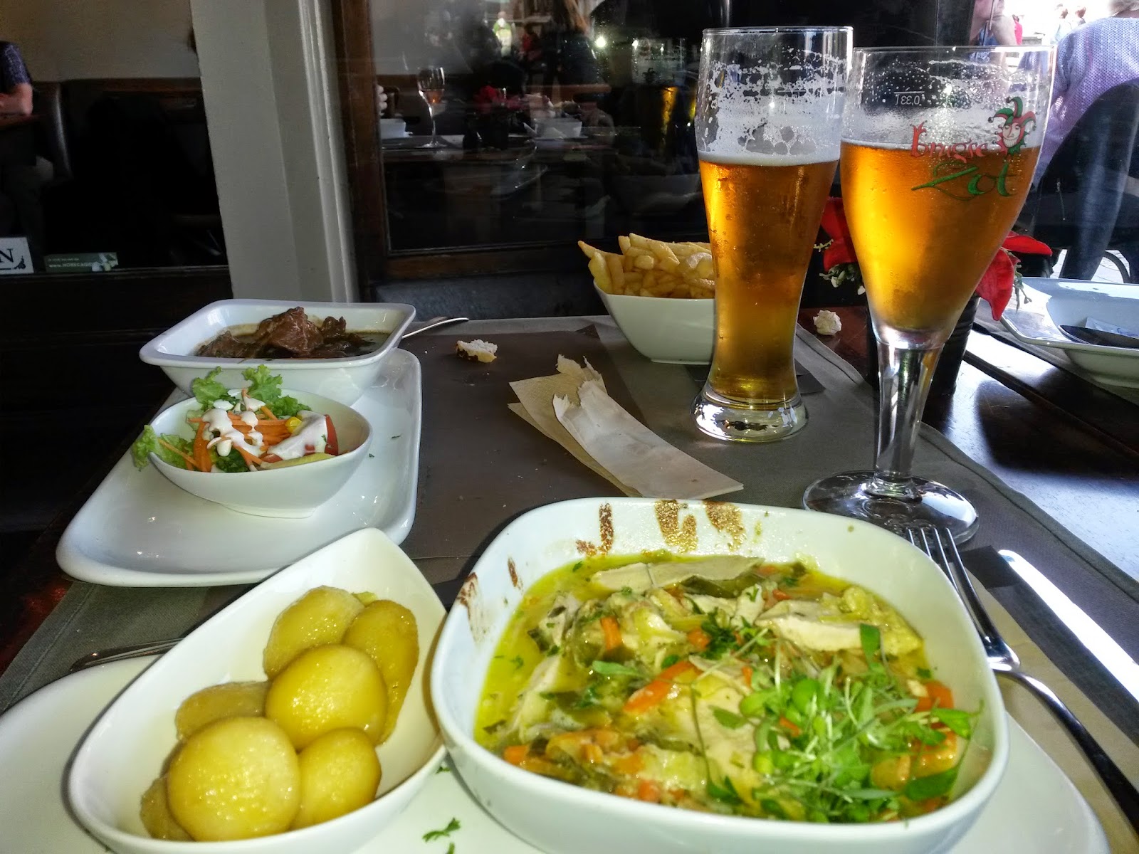 Il locale offre molti piatti di cucina tipica belga, inaspettatamente varia ed interessante. Tra le specialità di carne assaggiamo il coniglio alla gueuze, cioè cotto nella birra. In alternativa si può provare la carbonade flamande, manzo brasato in casseruola, sempre cotto nella birra gueuze oppure il waterzooi, pollo con panna, sedano, carote e cipolla (ma può essere anche a base di pesce).