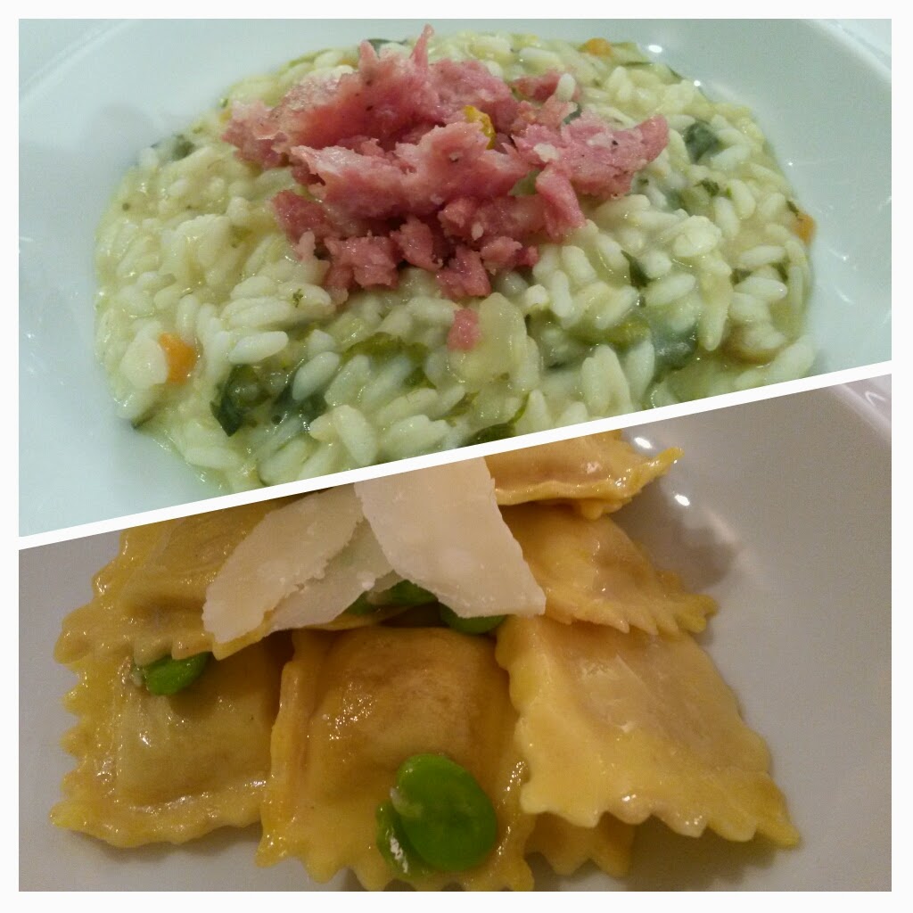 | Agnolotti con paletta e riso con verdure e salame di paletta |