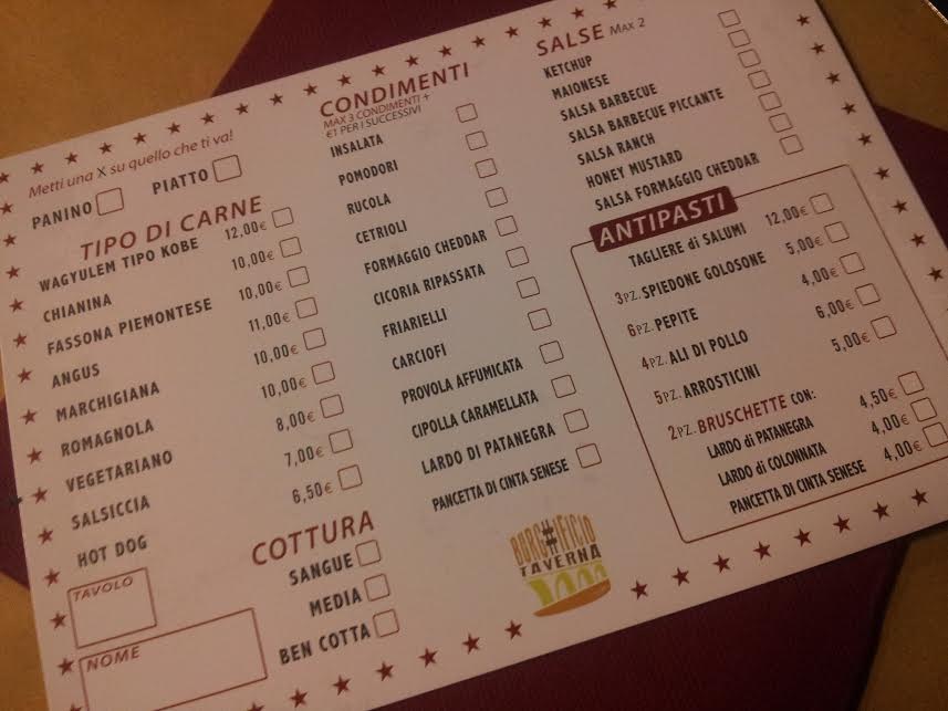 Qualche consiglio e dettaglio sui due menu: potete creare il vostro hamburger tramite la scheda predisposta, segnando il vostro nome, il numero di tavolo e soprattutto il tipo di cottura e vi vedrete arrivare una panino veramente speciale (l’hamburger può essere servito anche al piatto).