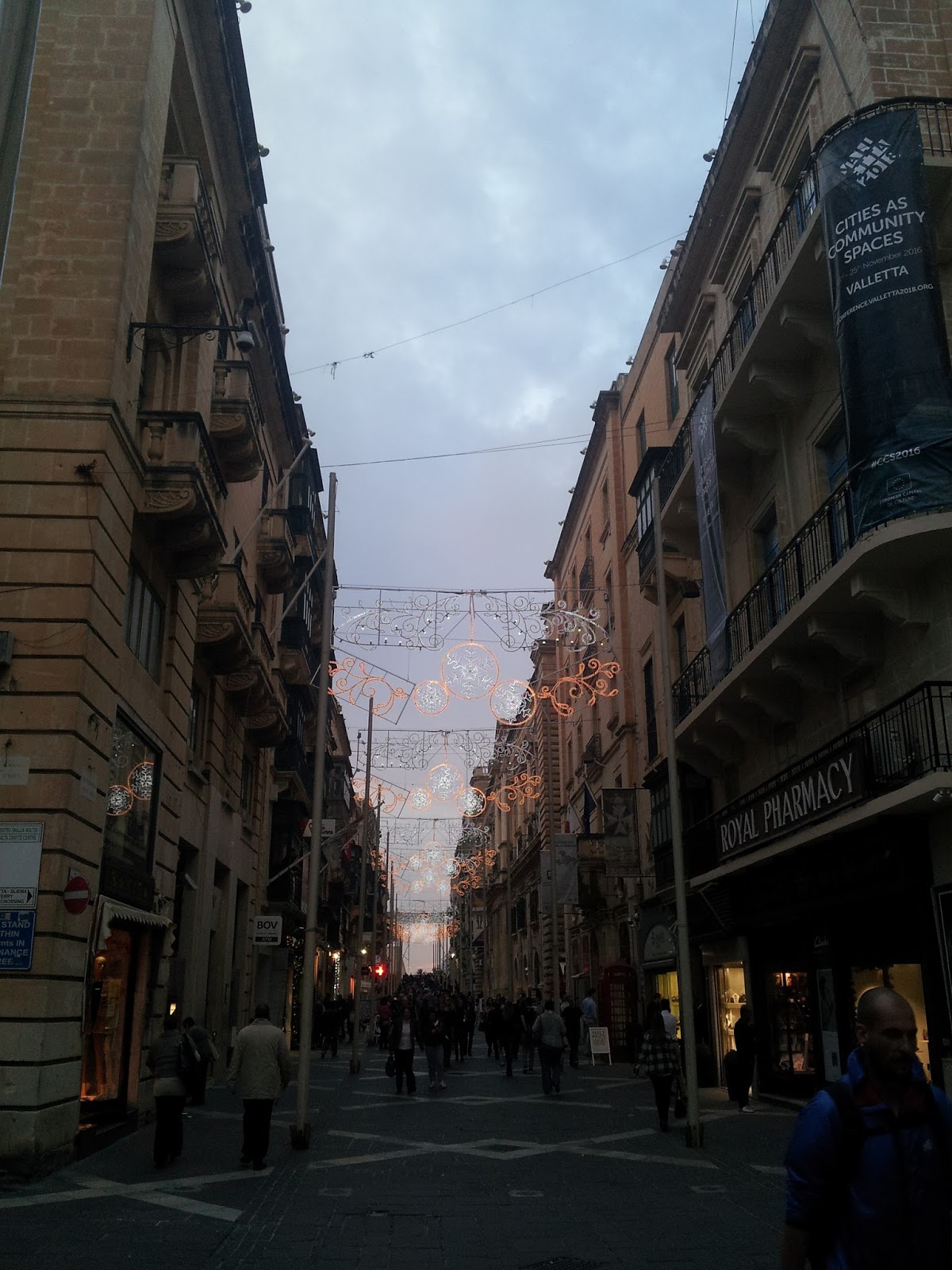 Il primo giorno decidiamo di fare un giro nella capitale, Valletta, e con gran sorpresa ci ritroviamo in clima natalizio a più di 20 gradi di temperatura; effettivamente essendo fine Novembre è anche logico, ma andare in giro in maniche corte e vedere pupazzi di neve e babbi natale in strada e nei negozi ci sembra alquanto strano!