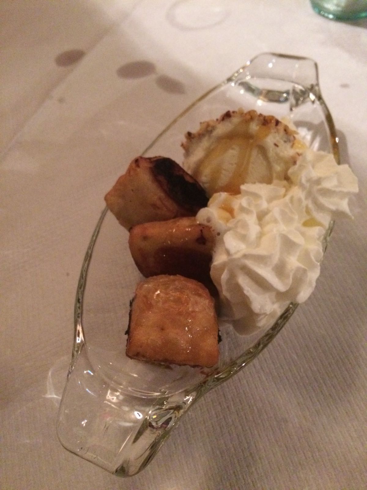 Io purtroppo non ho potuto provarlo, ma mi hanno assicurato che era buonissimo, abbiamo preso gli Imqaret (fagottini di sfoglia ripieni di datteri) caldi, serviti con gelato alla vaniglia e panna; il contrasto caldo freddo non doveva essere niente male.