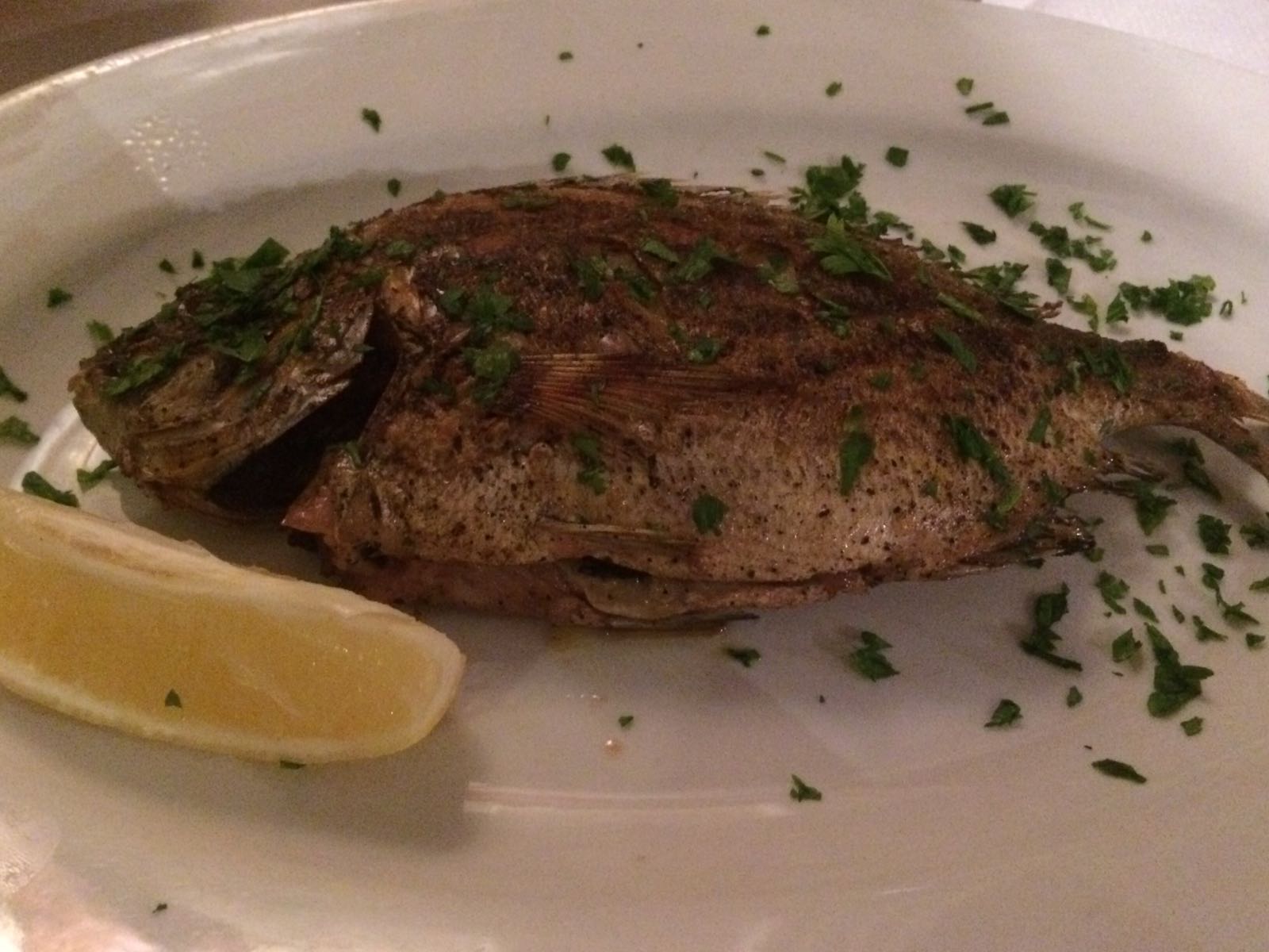 Abbiamo scelto il coniglio in umido, veramente buonissimo, un sapore potrei dire d’altri tempi, il pescato del giorno arrosto, perchè a pensarci bene eravamo li da 3 giorni e ancora non avevamo mangiato pesce, un vino bianco locale che ci è stato consigliato e un piatto di verdure stufate.