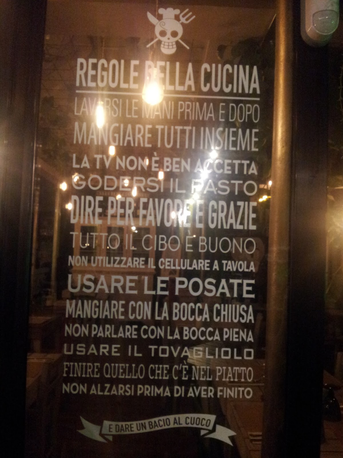 Il locale è molto particolare, ben curato e il personale molto gentile, ci si può fermare per un aperitivo, un pasto di pesce fresco, ma anche carne o per un semplice dopo cena. Soprattutto all’esterno, le regole della cucina sono ben chiare; anche se non credo di non aver mai rispettato l’ultima!