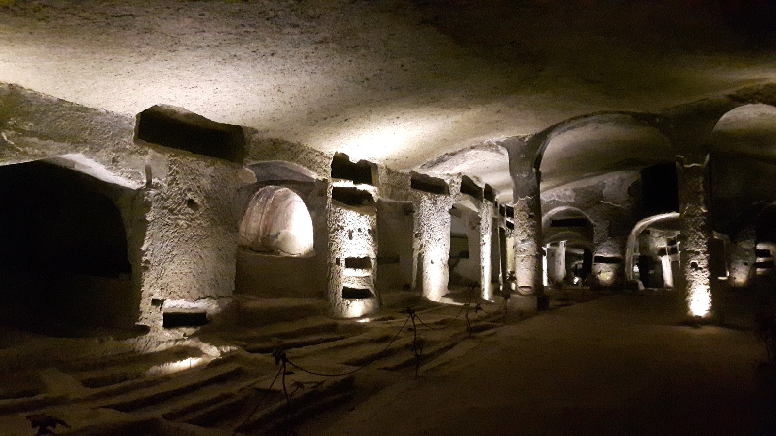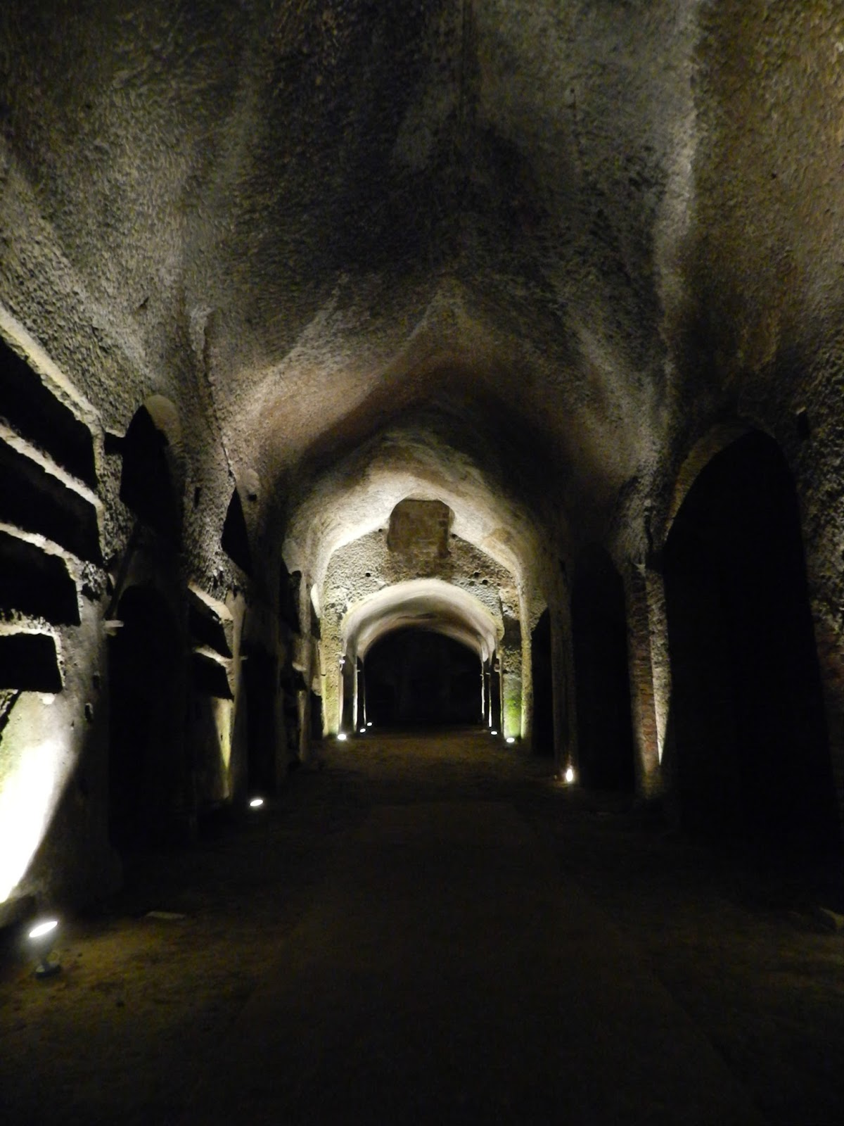 La passione e l’orgoglio per questo bel progetto traspare nelle parole delle giovani guide, molto preparate. La necropoli è costituita da due livelli non sovrapposti, dove colpisce l’eccezionale ampiezza dei luoghi. 2000 loculi e 500 arcosoli scavati nel tufo, materiale facilmente lavorabile ma anche estremamente solido. Il nucleo originario della necropoli risale all’epoca romana. Più tardi vi fu sepolto S.Agrippino e, nel V secolo d.C., vi furono trasportate le spoglie di S.Gennaro, rendendo il luogo meta di pellegrinaggio.