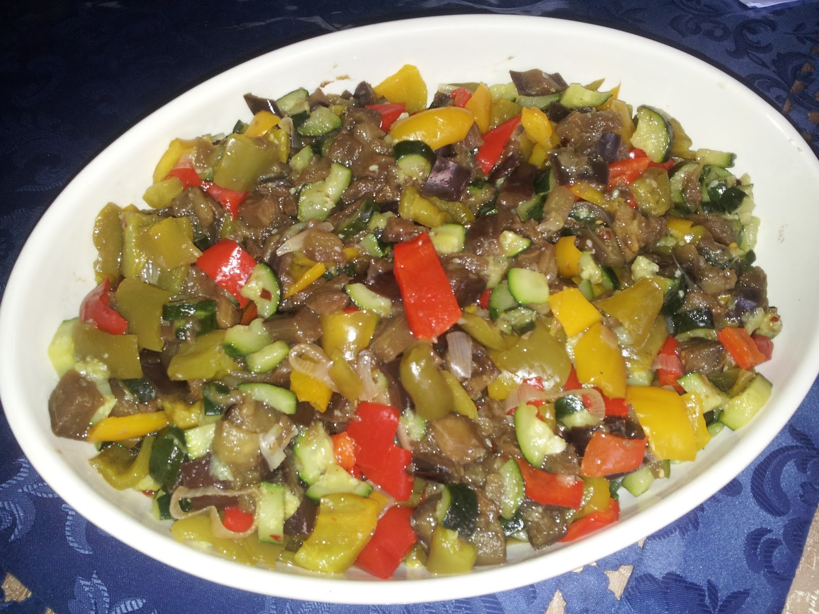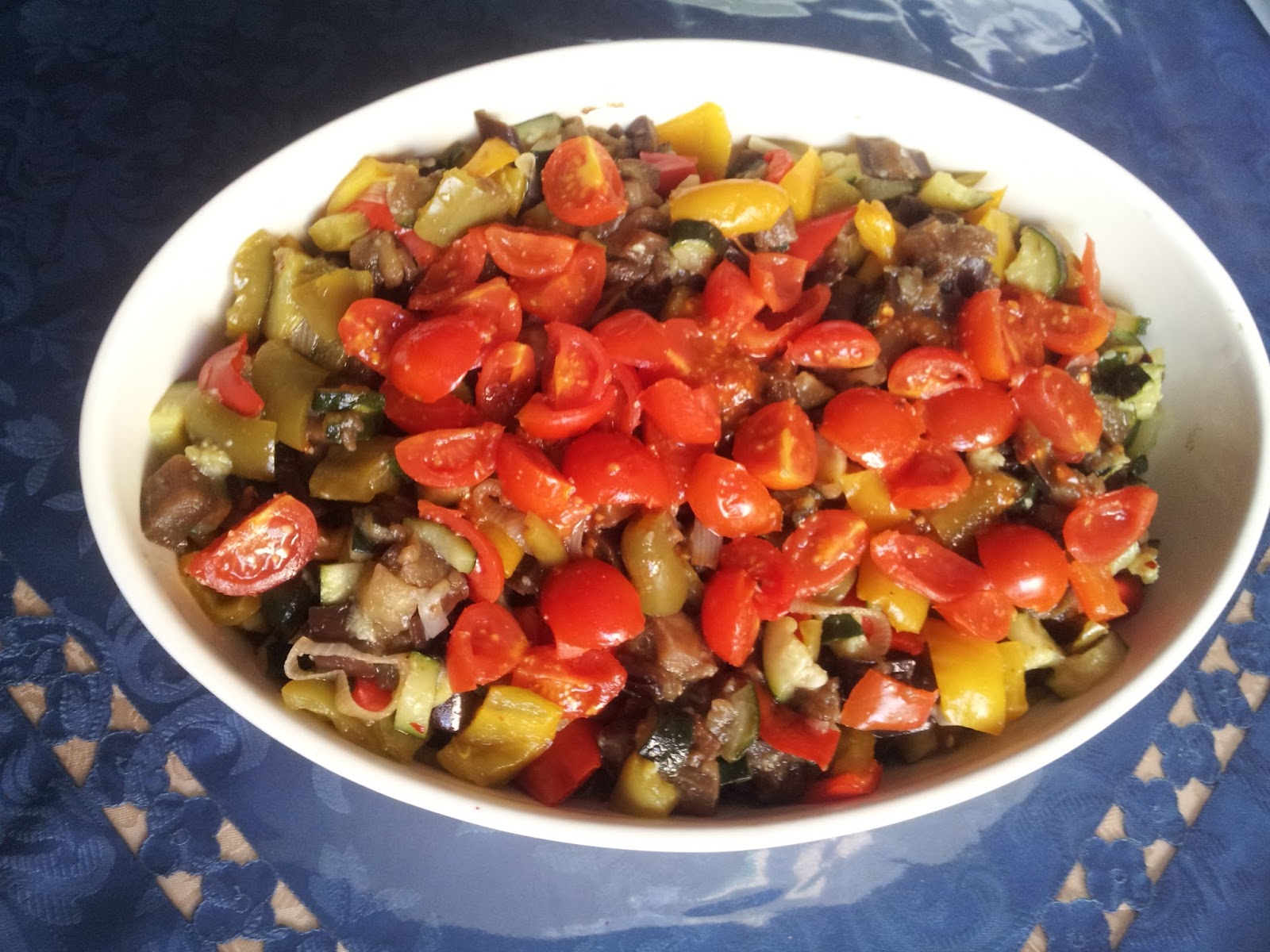 La ratatouille, originaria di Nizza, è preparata con pomodori, zucchine, peperoni, cipolla ed aglio stufate e condite con erbe provenzali e basilico.